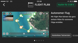 Die kostenpflichtige Erweiterung beinhaltet den sogenannten Flight Plan, mit dem sich Punkte und Ausrichtung der Drohne auf einer Karte im Vorfeld anlegen und speichern lassen, die dann die Drohne selbstständig abfliegt. Dieser sogenannte autonome Flug wird von der App in Reichweite und Flugzeit eingeschränkt, sodass es nicht zu einem Absturz durch Fehlplanung kommen kann.