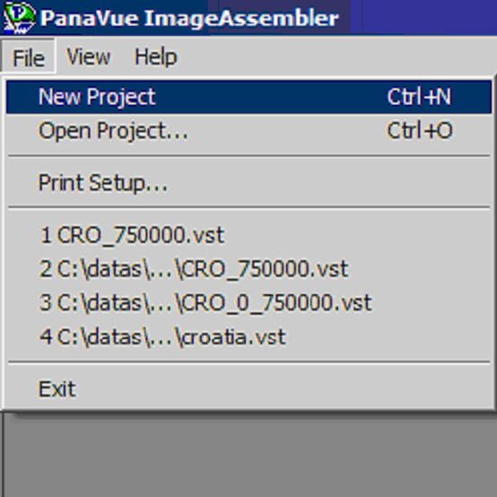 Zunaechst das Programm PanaVue oeffen, und ueber das Menue, wie im linken Bild, ein neues Projekt mit New Project anlegen.