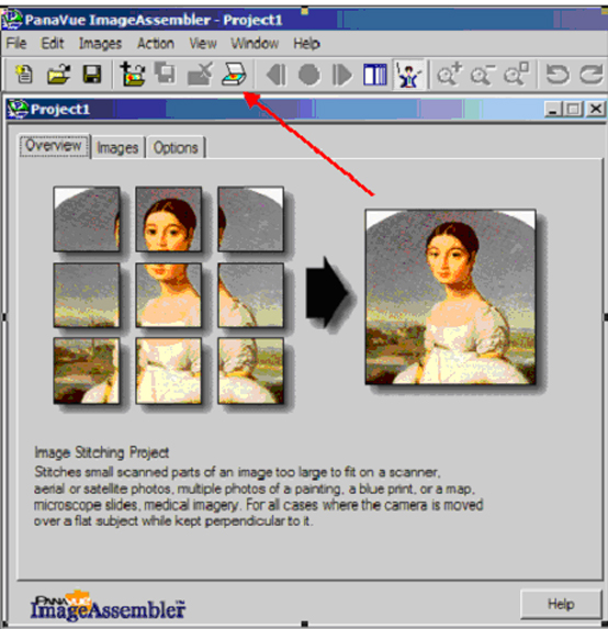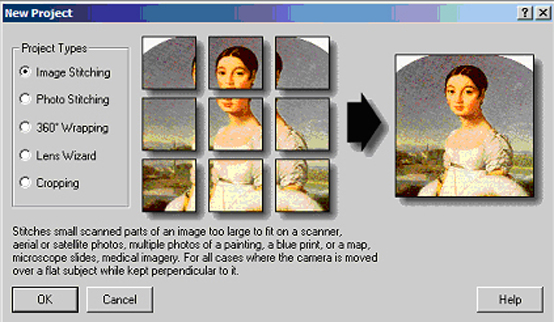 Direkt daraufhin oeffnet sich das Fenster im mittleren Bild. Hier nun Image Stitching auswaehlen und mit OK bestaetigen. Dann oeffnet sich das Fenster im rechten Bild und in der Kopfzeile seht Ihr das Icon fuer Scan.