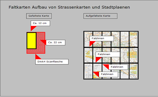 Ueblicherweise sind Strassenkarten und Stadtplaene (Faltkarten) wie im Bild rechts aufgebaut und entsprechen auch etwa diesen Abmessungen. Die gefaltete Flaeche der Karte ist deutlich kleiner als die DinA4 Flaeche des Scanners. Um zuegig einen Scan zu erstellen loesen wir zunaechst die gefaltete Karte aus dem Cover.