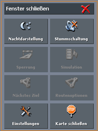Einstellungen, die über den kurzen Klick zu erreichen sind: Tag/Nacht, Stummschaltung, Sperrung, Simulation, Nächstes Ziel, Routenoptionen, Einstellungen und Karte schließen.