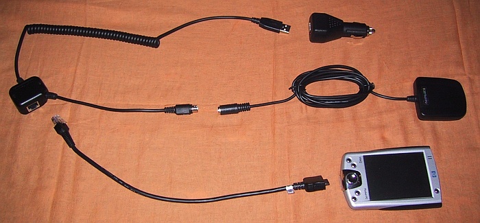 Die Verbindung zum PDA stellt ein 20 cm langes Kabelstück her, das durch einen Western-Stecker mit dem Y-Kabel verbunden wird. So muss bei Wechsel auf einen anderen PDA nur dieses kurze Stück neu gekauft werden. Dieses Kabel gibt es für fast jeden PDA, dieser muss natürlich bei Bestellung angegeben werden. Die PS-2 Verbindung zwischen Y-Kabel und Maus ist Standard und erlaubt unter Umständen auch den Einsatz mit anderen Mäusen oder Adaptern. In diesem Fall sollte aber vorher gemessen werden, nicht immer sind die Steckerbelegungen bei PS-2 identisch !