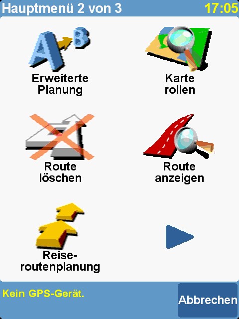 Leider können die Menüs des NAVIGATOR 5 nicht mehr mit bordeigenen Mitteln konfiguriert werden wie bei den Vorgängerversionen. Findige Köpfe im Forum von Pocketnavigation haben hierfür aber längst Lösungen entwickelt, selbst Tools für den PDA gibt es inzwischen. Ein wichtiger Punkt, zwingt doch das Originalmenue teilweise zu unnötig vielen Klicks, da wichtige Buttons erst auf der zweiten oder dritten Seite liegen.