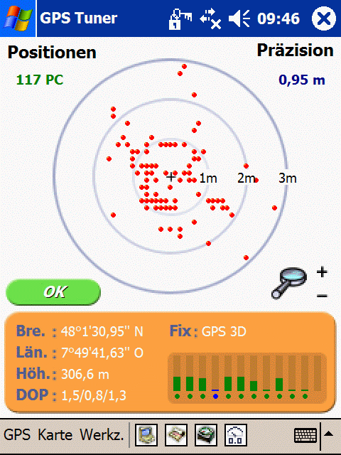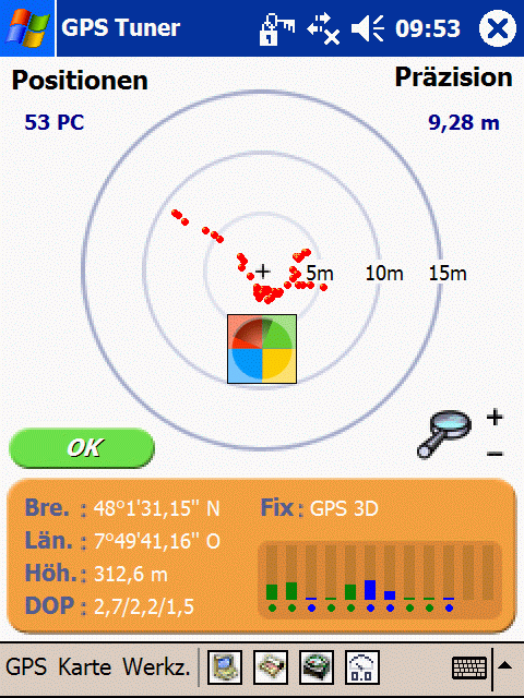 Auch wenn – beim Einsatz von GPSTuner – im Kompass-Mode der Zielpunkt mit einer Genauigkeit von ca. 10 m gefunden werden kann, ist das für Geocacher evtl. unzureichend. Dies untermauert auch ein Versuch bei freiem Himmel, guter Satellitensicht, bei dem ein Punkt an dem ich mich befand, nochmal als Ziel eingegeben wurde. 100 m weggelaufen, über Kompasssuche Ziel gesucht, am Zielpunkt angelangt (tatsächlich) wurde als Entfernung zum Zielpunkt ca. 10 m (wechselnd) angezeigt.