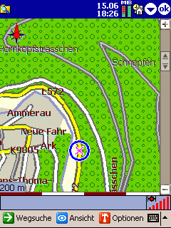 Prinzipiell lassen sich aus diesem ersten Bildschirm immer die drei Haupt-Menüpunkte Wegsuche, Ansicht und Optionen aufrufen. Der genaue Inhalt dieser Menüpunkte wird noch besprochen.