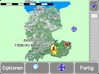 Weiters kann man einen Kompassmodus aktivieren, der die Entfernung (Luftlinie) zum Ziel zeigt und für noch bessere Orientierung beim Fahren dient. Leider wurden keine bikerspezifischen OVI (Ort von Interesse) zu den üblichen hinzugefügt, aber es gibt ja bei pocketnavigation.de einige Overlays nur für Motorradfahrer. Mehr zum Thema Overlays für Rider: Overlays für TomTom