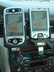 Nachdem die GPS-Antennen und PocketPCs schon hergerichtet waren, konnte ich mir den Vergleich der 9810 zum Modulempfänger OHNE Zusatzantenne nicht verkneifen. Ohne näher darauf einzugehen, hier zeigt sich deutlich die Überlegenheit der leider nicht mehr produzierten 9810. Beide GPS-Empfänger liegen hier auf dem Armaturenbrett.