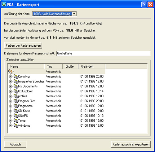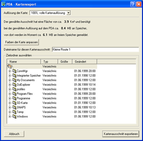 Den PDA an die Dockingstation und ab geht´s… Hier fällt auch sogleich ein kleines Manko auf: die Karten lassen sich nicht auf der Festplatte des Rechners ablegen, sondern müssen direkt auf den PDA exportiert werden somit muss eine Verbindung zum PDA bestehen. Wäre doch hier bestimmt kein Hexenwerk gewesen eine Funktion zum lokalen Speichern der Karten einzubauen vielleicht in der nächsten Version? Störend ist das deshalb auch weil der Export direkt auf den PDA doch vermutlich länger dauert als auf das lokale Laufwerk des PC´s. Wer hier schon mal auf Vorrat mehrere Touren planen und schon für den PDA vorbereiten will, der wird diesen Nachteil spüren. Legen wir los: Im Menü PDA/Aktuellen Kartenausschnitt an PDA übertragen auswählen und schon gehts weiter mit Angaben über den Grad der Komprimierung, den Kartennamen sowie zu guter letzt den Pfad auf dem PDA.
