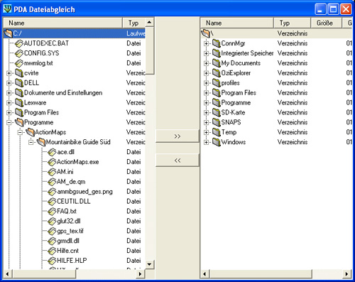 Ein nettes Gimmick ist die Möglichkeit die Gesamthelligkeit und die Helligkeit der grünen Flächen noch bearbeiten zu können. Erhöht man die Helligkeit der grünen Flächen, so verbessert sich die Ablesbarkeit der Karte insbesondere der Waldwege und Strassen die durch Waldgebiete führen. Um die Karte nun endgültig zu exportieren den Button Kartenausschnitt exportieren klicken und die Software machen lassen! Ist die Karte exportiert fehlt noch der Pfad (Track): Menü PDA/Pfade mit PDA austauschen ausführen und schon erschein erneut ein Fenster. Linke Seite die lokale Festplatte und die rechte Seite der PDA. Auf der linken Seite die Routen-Datei (*.PTH) auswählen und auf der rechten Site den Zielpfad. Mit dem 2 Buttons in der Mitte dann die Datei übertragen. Es lassen sich leider nicht mehrere Dateien gleichzeitig übertragen. Wer mit der Zeit viele Touren angelegt hat, der wird ohnehin den direkten und einfacheren Weg über ActiveSync wählen.