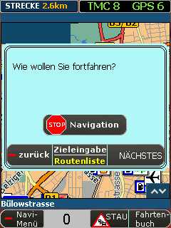 Sollte die Glopus-Anzeige nicht sofort während der Navigation erscheinen, bitte die Tasten Navi-Menü und dann zurück drücken (Im Original: stoppen und fortsetzen). Die Anzeige sollte dann erscheinen.
