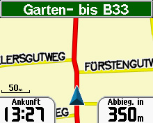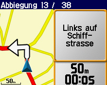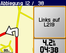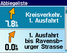 Will man keine Kartenansicht, oder findet man diese zu klein, so gibt es auch noch die Ansicht mit den Abbiegehinweisen die Abbiegeliste. Während der Navigation die Karte mit der linken Taste verlassen und auf die Abbiegeliste wechseln. Sofort erscheint die Liste an der aktuellen Position. Die Pfeildarstellung ist ebenso wie die Entfernung gut zu erkennen und die kurze Beschreibung ist ebenfalls gut lesbar. Die nächste Abbiegung ist immer die oberste, hat man diese passiert, wird sie aus der Liste entfernt. Man braucht nur ganz nach oben zu scrollen um die nächste Abbiegung zu sehen. Genügt diese Ansicht nicht? Mit einem Druck auf die Scroll–Taste kommt man zu der geteilten Ansicht. Die linke Seite zeigt das Bild der nächsten Abbiegung und auf der rechten Seite die übrigen Angaben, wie Beschreibung, Entfernung und der Countdown bis zum Ereignis. Nähert man sich dem Punkt bis auf 50-150 Meter so wird die eigene Position auf die Karte mittels Pfeil eingeblendet man sieht sich also an das Ereignis heranfahren und dann wieder von dem Punkt wegfahren. Die geteilte Ansicht hat mir in der Praxis sehr gut gefallen. Erinnert bedingt durch das kleine Display – ein wenig an die Navigation per Handy.
