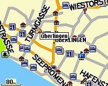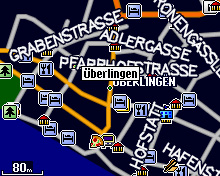 Zeigt einfach nur die Karte (bei SAT-Fix die aktuelle Position). Im oberen Bildrand wird die grobe Richtung oder der momentane Status angezeigt. Links unten die Geschwindigkeit und rechts unten die Himmelsrichtung. Während der Navigation steht links unten die vermutliche Ankunftszeit und rechts unten die Entfernung zum nächsten Abbiegepunkt. Mit dem Scrollrad lässt sich die Karte zoomen. Laut Hersteller von 800km bis 20m sowohl in 2D als auch in 3D. Ebenso interessant ist die Tag/Nacht-Ansicht der Karte, die auch im gesamten Menü funktioniert. Diese Ansicht lässt sich manuell oder automatisch umschalten. Durch langes drücken der Scroll-Taste in der Kartenansicht wird der aktuelle Standort in den Favoriten gespeichert und erhält eine fortlaufende Nummer die man gleich in einen Namen ändern kann. Der Punkt ist allerdings sofort gespeichert und man kann mit der Zurück-Taste zur Kartenansicht zurückkehren. Diese Funktionsweise ist hilfreich, wenn man während der Fahrt (Sicherheitshinweis beachten!) schnell mal eine Position speichern möchte, ohne groß abgelenkt zu werden. Auf den Bildern unten sind die 3 Ansichtsarten zu sehen: unten links die 3D-Ansicht, unten mitte die 2D-Ansicht und ganz rechts unten die genordete Ansicht.