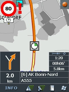 Bild 3) Das Programm warnt bei überhöhter Geschwinidgkeit optisch und akustisch. Diese Funktion ist leider nicht auf allen Straßen verfügbar und kann auf Grund fehlender Aktualisierung falsch sein.