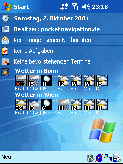 Das WetterplugIN2 erlaubt das Einbinden von Wetter- daten in die Heute-Ansicht von Windows Mobile 2003 / 2003 SE und Windows Mobile 5 PDAs. Durch Klick auf das Tages-Icon wird die Detailansicht mit vielen interes- santen Wetterwerten aufgerufen (rechter Screenshot). Die Wetterdaten werden über eine Internetverbindung aktualisiert, dabei spielt es keine Rolle ob diese Internet- verbindung über das Cradle, GPRS, UMTS oder WLAN zustande kommt.