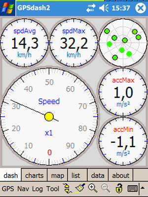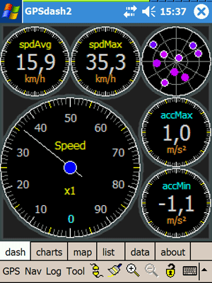 Standardmäßig werden alle Einstellungen, Kartenverzeichnisse und andere Dateien im Ordner \My Documents\GPSdash2 abgelegt; egal ob man in den internen Speicher oder auf SD-Karte installiert. Alle Einstellungen werden in XML-Dateien gespeichert, welche bei Bedarf gesichert und wieder eingespielt werden können. Auch die farbliche Darstellung der Anzeigen ist in einer XML-Datei gespeichert. Somit gibt es Spielraum für ein wenig optisches Tuning. Am unteren Bildschirmrand befinden sich noch weitere Knöpfe und Menüs zum Steuern und Einrichten des Programms.