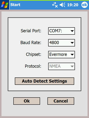 Keine Navigation ohne GPS-Empfang. Im Test diente eine Royaltek RBT-1000 Bluetooth-GPS-Maus als Empfänger. Die Konfiguration der Software ist denkbar einfach. Im Menü GPS/Configure kann man die entsprechenden Werte wie serieller Anschluss, Baudrate, Chipsatz und Protokoll einstellen. Auto Detect Settings hat beim verwendeten Empfänger ebenfalls gut und schnell funktioniert – die Maus wurde binnen weniger Sekunden erkannt und konfiguriert. Der Empfänger muss aber mit dem PDA am Bluetooth-Port bereits konfiguriert und gekoppelt worden sein; nur dann ist ein automatisches erkennen möglich. Wer GPSDash2 testen möchte ohne gleich beim ersten Mal lange Fahrten zu machen um zu sehen ob alles sauber funktioniert, der kann auch ein NMEA-Logfile laden und abspielen.