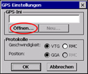 Beim ersten Start müssen ein paar wenige Einstellungen vor- genommen werden, damit das Programm erfolgreich mit dem GPS-Empfänger kommunizieren kann. Dazu klickt man im ersch- einenden Fenster auf die Schaltfläche Öffnen und wählt daraufhin eine zum Gerät passende GPS-Ini*. Je nach unterstützten Protokollen ihres GPS-Empfängers können Sie noch das Protokoll für die Geschwindigkeit festlegen. Es wird jedoch empfohlen die Standard-Auswahl (VTG) gesetzt zu lassen, sofern der GPS-Empfänger dieses Protokoll unterstützt.