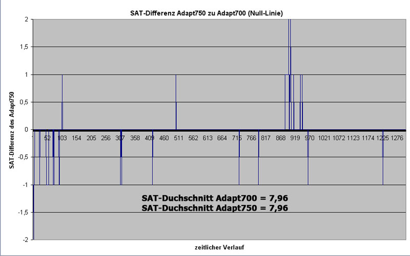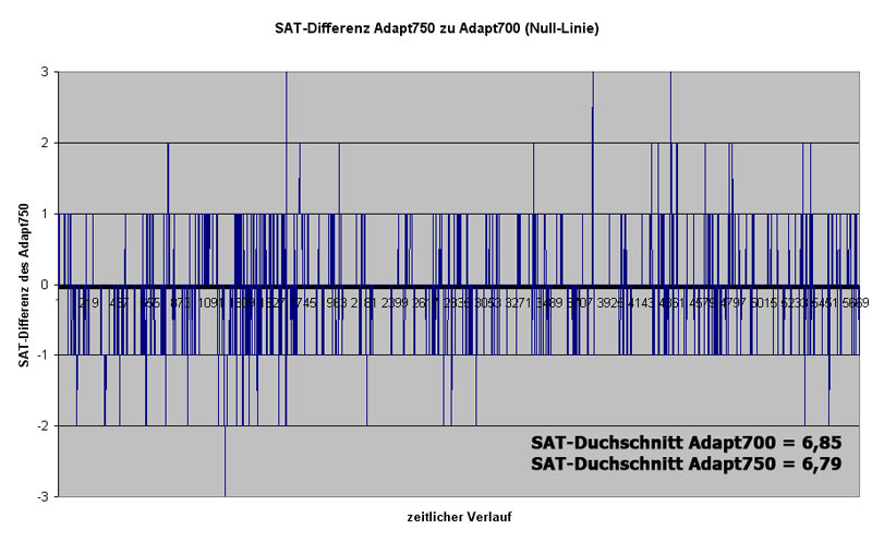 Als Basislinie (Null-Linie) ist der Adapt 700 gewählt. Auf der Ordinate ist die SAT-Differenz des Adapt 750 auf- gezeigt. Daraus abgeleitet ergibt sich, das Punkte die überhalb der Null-Linie liegen mehr SATs bedeuten. Ergo zeigen Punkte unterhalb der Null-Linie auf weniger SATs auf. Auf den ersten Blick würde man wieder von einer Gleichheit der beiden Empfänger reden. Das zeigt sich auch schon im nur geringfügig voneinander abweichenden SAT-Duchschnitt von 0,06.