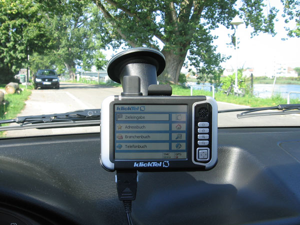 Die Autohalterung ist sehr schnell und leicht zusammengeschraubt. Vorteil hierbei: es ist KEIN Schwanenhals! Das Ding sitzt wirklich sehr stabil. Durch die zwei Verstellmöglichkeiten lässt sich der PNA auch schön und exakt platzieren. Die Aufnahme für den K580 ist robust und hält das Gerät fest im Griff. Auf der linken Unterseite des Gerätes befindet sich die Buchse für das Kfz-Kabel mit dem TMC-Empfänger und der Wurfantenne. Störend hierbei ist der entstehende Kabelsalat. Es gibt hier wohl Lösungen von GNS, um die Antenne an die Bordantenne des Fahrzeugs anzuschließen; das wäre hier die Lösung um den Kabelsalat etwas zu entwirren.