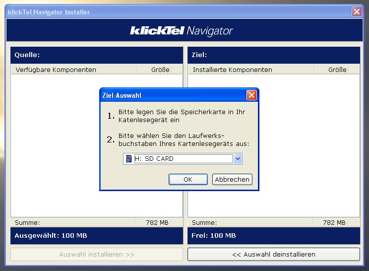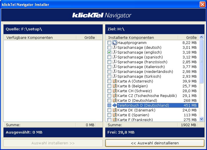 Auf der mitgelieferten DVD befindet sich die Version 1.0.2309. Installiert werden die einzelnen Komponenten durch ausführen der Setup.exe auf der DVD (oder mittels Autorun). Nach dem Zustimmen der Lizenzvereinbarung sucht das Programm nach dem Kartenlesegerät. Wenige Sekunden später wird die aktuelle Auswahl angezeigt. Die einzig mögliche Funktion hier ist Komponenten und/oder Karten von der SD-Karte zu entfernen oder welche hinzuzufügen. Um das Update von Navigator 1.1 zu installieren einfach die mitgelieferte Setup-Datei ausführen und die entsprechende Auswahl auf die SD-Karte übertragen. Das Build der neuen Version Navigator 1.1 ist dann kTNavigator 1.1.2404.