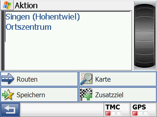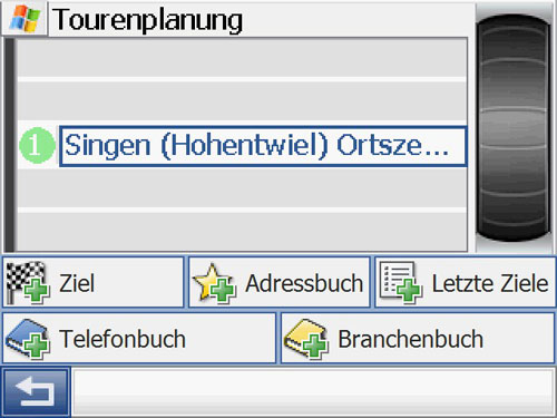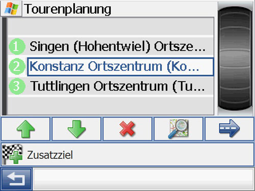 Eine Möglichkeit von vorneherein eine Route zu planen sucht man zuerst vergebens: den Punkt Route oder mehrere Ziele gibt es nicht. Trotzdem besteht die Möglichkeit mehrere Ziele einzugeben. Über die gewohnte Zieleingabe das erste Ziel eingeben, dann erscheint ein Button Zusatzziel – hier werden dann alle weiteren Ziele eingegeben. Weitere Stationen kann man über die direkte Zieleingabe, aus dem Adressbuch, den letzten Zielen oder dem Telefon – oder Branchenbuch hinzufügen. Allerdings nur maximal 4 Stationen, dann ist Schluss – merkwürdig! Diese kann man noch in der Reihenfolge ändern; aber das war´s dann schon. Wieso lassen sich keine Routen speichern? Den Grund für das Fehlen dieser Funktion und die Beschränkung auf 4 Ziele kann ich nicht nachvollziehen.
