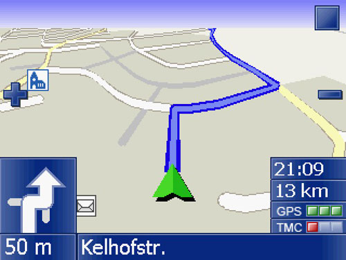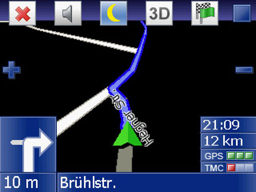 Außerdem findet man dort die Funktionen zum Umschalten der 2D/3D-Ansicht und zum Anzeigen der gesamten Route. Die Knöpfe dieses Menüs sind leicht bedienbar und mit ausreichendem Abstand; fingerfreundlich eben. Bei aktivem Routing erscheint an der Position des Menüs der Straßenname der nächsten Straße. Im unteren Bildrand wird der aktuelle Straßenname angezeigt.