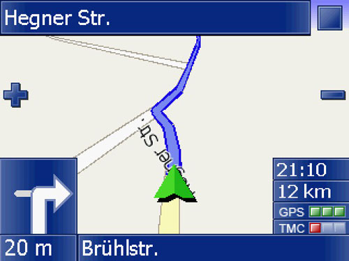 Das Zoomen der Karte ist mit den Plus – und Minus Symbolen einfach. Hierbei ist es manchmal störend, dass man den Autozoom nicht abschalten oder anpassen kann. Auch fällt auf dass sehr wenige Straßennamen in der Karte angezeigt werden, was aber nicht unbedingt ein Nachteil sein muss. Die Positionierung des Pfeils hinkt ein klein wenig nach; ist aber nicht weiter störend.