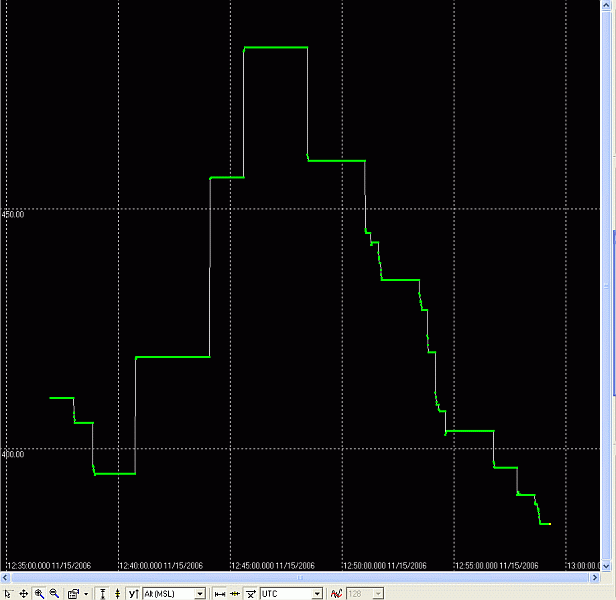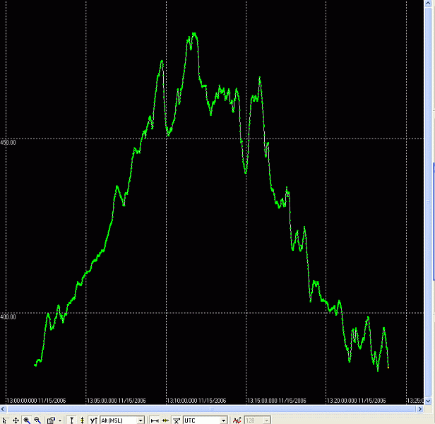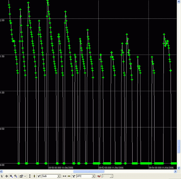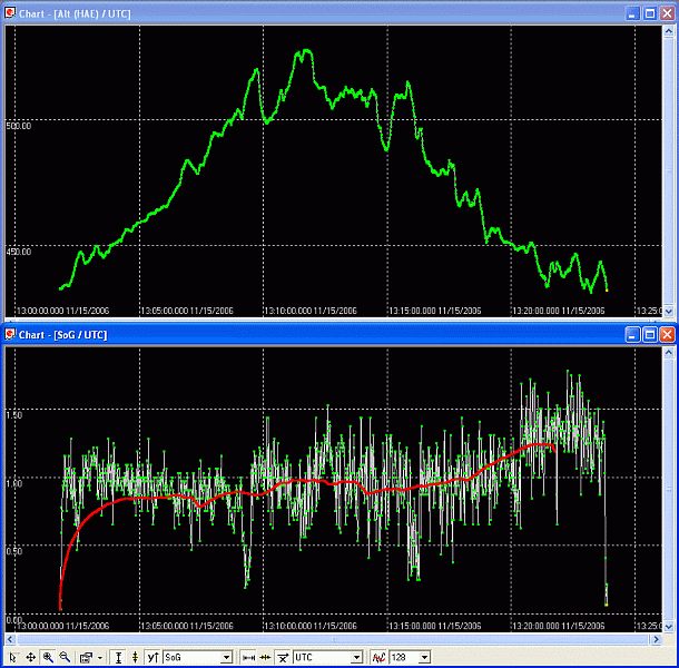 Das ergibt ein Bild wie obenstehend, man sieht den Abbruch bei etwa 1,2 m/s entspricht etwa 4,32 km/h. Alle diese Auswertebilder sind mit u-center gemacht.