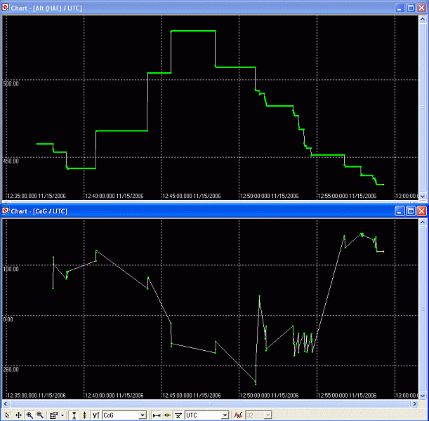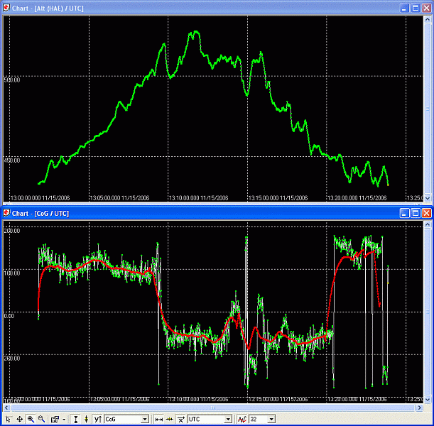 Höhe und Geschwindigkeit. Bei der Geschwindigkeit ohne SN ist ein Mittelwert in rot mit eingezeichnet, man sieht, dass die mittlere Geschwindigkeit recht konstant ist. Mit SN ergeben sich an jeder senkrechten (Treppen-) Flanke der Höhe nur kurze Peaks der Geschwindigkeit. Nur an diesen Stellen erscheint im Log (für 4 sek. meist) eine Geschwindigkeit > 0 – und natürlich aktualisierte Werte von Höhe, Koordinaten, Track- winkel. Die Maus sendet kurzeitig aktuelle Daten. Wodurch hier diese kurzzeitigen Überschreitungen des SN-Einsatzpunktes generiert wurden, ist noch nicht ganz klar. Geschwindigkeitsüberschreitungen sollten aufgrund des Geländes weitestgehend ausgeschlossen werden können. Ein wahrscheinliche Möglichkeit wäre eine fiktiv erzeugte Geschwindigkeit, wie sie beim Wechsel der Satelliten-Konstellation auftritt.