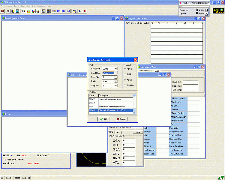 Nach Start des GM klicke man den ersten Button oben links an oder wähle Setup/Data Source. Im sich öffnenden Fenster gibt man den Port oben ein oder wählt ihn unten. Als NMEA-Baudrate empfiehlt Leadtek 57600, im entsprechenden Feld eingeben. Unter Protocol bleibt NMEA, restliche Felder bleiben unverändert. OK anklicken. Wenn die Maus eingeschaltet (und verbunden) ist, wird gleich connected, NMEA-Protocolle laufen im Development Data Fenster durch.