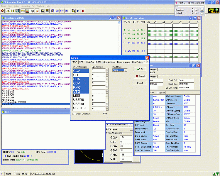 Nun wollen wir wieder zu NMEA zurück. Dazu wählen wir Action/Switch to NMEA. Im nächsten Fenster klicken wir auf die gewünschten Protokoll-Bezeichnungen, diese werden damit blau – und nur die blauen werden gesetzt! – und das Update Rate Feld wird mit 1 vorbesetzt. Wir wählen wie im Bild GGA, GSA, GSV, RMC und VTG und setzen GSA und GSV auf 5 (GSA/5 reicht völlig aus, im Lieferzustand war es auf 1 gesetzt). Nun die Baudrate noch auf die NMEA-Baudrate von 57600, OK, und im Development Data Feld kommen wieder NMEA-Daten. Prog mit Setup/Exit verlassen.