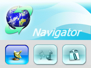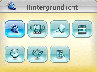 Bevor man in das Hauptmenü des Falk Navigator kommt, begrüßt einen ein weiterer Bildschirm. Hier kann der integrierte MP3-Player oder die Navigationsanwendung gestartet und folgende Grundeinstellungen verändert werden:
