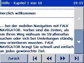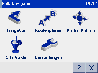 Nach einem Klick auf die Schaltfläche Navigator startet kurz darauf der Falk Navigator. Ist der Startbildschirm mit ok bestätigt, befindet man sich im Hauptmenü. Nicht nur das Design im schlichten Weiß und dunklen Blau ist einfach gehalten, das komplette Menü ist sehr aufgeräumt. Gerade einmal fünf Buttons, sowie eine Hilfe und eine Schließen Schalt- fläche warten hier darauf angewählt zu werden: