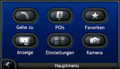 Die Menüführung ist einfach und schnell. Sechs Buttons warten nach dem Start darauf bedient zu werden. Unter Gehe zu befinden sich verschiedene Möglichkeiten eine Adresse einzugeben. Mit dem Button POIs können Einstellungen für Points of Interest getroffen werden. Wer besonders wichtige oder interessante Adressen speichern möchte, kann dies unter den Favoriten tun. Das Menüfeld Anzeige verbirgt Einstellungsmöglichkeiten für den Bildschirm, die Kartenanzeige mit Tag- Nacht-Farbtönen, Farbschemen und Darstellung der Karte und einen Menüpunkt für die Maße. Hier kann ein Positionsformat eingestellt und ein anderes Zeitformat gewählt werden. Wählt man den Menüpunkt Einstellungen, erreicht man die Routenoptionen, ein Lernprogramm, Systemeinstellungen und Allgemeine Infos zur Software Version und Gerätenummer. Nach Drücken der Schaltfläche Kamera, können eigene Bilder gemacht bzw. verwaltet werden.