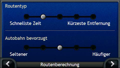 Die Möglichkeit zwischen schnellster Zeit und kürzester Route, sowie Autobahn selten und häufig bevorzugen in verschiedenen Stufen wählen zu können, lässt den Nutzer noch besser in die Routenberechnung eingreifen. Allerdings bleibt fraglich, in wie weit sich die einzelnen Stufen wirklich auf die Routenberechnung auswirken, während unserer Testfahrten konnten wir keine Abweichungen festellen. Vermisst haben wir eine Auswahl für verschieden Geschwindigkeits- profile und eine Möglichkeit Autobahnen komplett zu meiden.