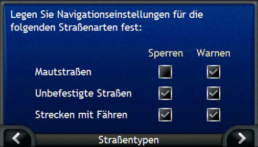 Zudem gibt es noch Navigationseinstellungen für verschiedene Straßenarten. Für Mautstraßen, Unbefestigte Straßen und Strecken mit Fähren gibt es die Möglichkeit, diese komplett zu umfahren oder sich vor ihnen warnen zu lassen.