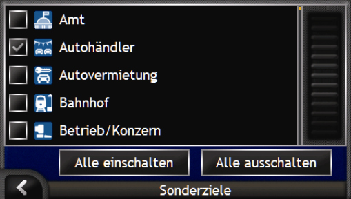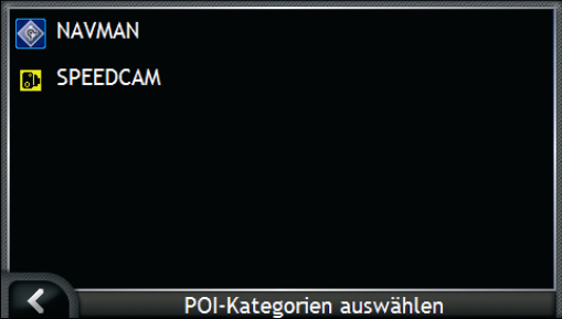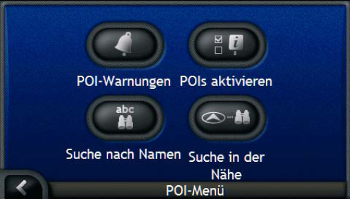 Der Umfang der mitgelieferten POIs kann sich sehen lassen. Auch etwas ausge- fallenere Orte wie Freizeitparks, Eissportanlagen oder Kasinos sind bereits auf dem iCN720 vorhanden. Die POIs lassen sich einzeln aus- und einschalten. Eine Suche nach POIs ist entweder nach Namen oder in der Nähe möglich. Die Suche von POIs direkt aus der Kartenansicht ist nicht möglich, dazu muss der etwas umständliche Weg über das Menü gegangen werden.