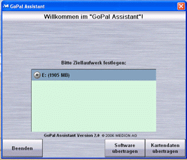 Die Medion GoPal AE 2 Software wird auf einer DVD ausgeliefert, hierbei handelt es sich um eine Kombiversion für PNA und PDA. Nach dem Autostart wird der Anwender gefragt, was er installieren möchte, Software oder Kartenmaterial. Nach der Auswahl Software wird ein weiteres Fenster geöffnet, hier wird nun entschieden zwischen PDA oder PNA. Im Test gab es keine Probleme bei der Installation auf unseren Testgeräten (Loox 560 und MDA Compact). Eine kleine Einschränkung muss man jedoch machen: Der Medion-Assistenten möchte die SD-Karte formatieren, was nicht unbedingt sein müsste.
