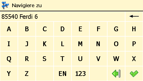 Die Zieleingabe ist, wie auch schon aus den Vorversionen bekannt, ein Unikum unter den Navigationssystemen. Hier muss man sich nicht wie bei anderen Systemen durch eine Vielzahl von Eingabemasken hangeln, sondern es können alle Informationen in ein einziges Ein- gabefeld eingegeben werden. Auch spielt die Reihenfolge der Eingabe keine Rolle, d.h. es kann jegliche Kombination aus Straße, Ort, Hausnummer… verwendet werden, wobei theoretisch schon die ersten drei Zeichen ausreichen.