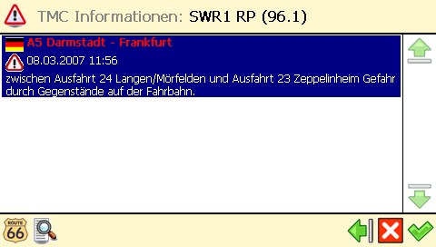 Leider gibt es keine Möglichkeit den TMC-Empfang zu konfigurieren (z.B. Wahl des Senders oder nur Staumeldungen auf der Route). Die TMC-Anbindung ist also noch sehr einfach gehalten, auch eine TMC-Pro Anbindung gibt es in dieser R66 Version nicht.
