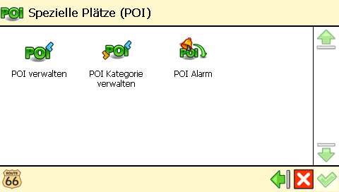 Route66 besitzt eine Funktion um vor POIs zu warnen. In dieser können sowohl eigene als auch externe POI's angewählt und mit einem beliebigen Warnton verknüpft werden. Die Entfernung (500 bzw. 750m, 1, 2, 5, 10km), ab der gewarnt werden soll, ist einstellbar, ist aber für alle gewählten POI’s dieselbe! Die letzten 500 Meter vor dem POI werden visuell – zuerst in 50 m Schritten und ab 50m Entferung in 10m Schritten – auf dem Bildschirm angezeigt.