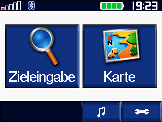 Die Menüführung ist auf den ersten Blick einfach und logisch aufgebaut und verfügt über 3 Hauptansichten. Nach dem Start erscheinen zwei grosse Buttons, einmal Zieleingabe und einmal Karte, deutlich kleiner ein Schraubenschlüssel für die Einstellungen sowie ein Note für den MP3-Player. Ist ein Handy gekoppelt, erscheint zusätzlich ein Hörersymbol, unter dem sich dann die Ruflisten etc. verbergen.