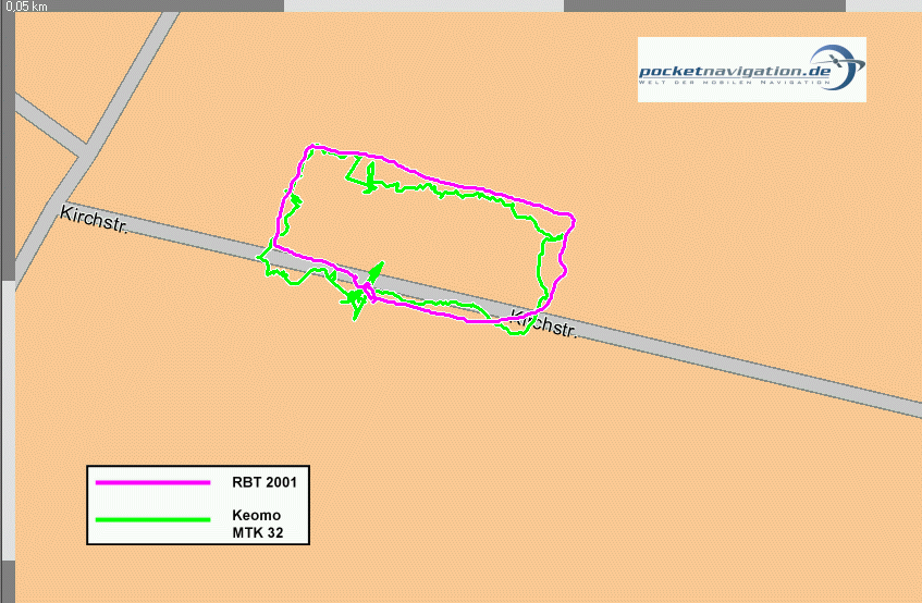 Im linken Bild ein extrem langsam gegangenes Rechteck, Geschwindigkeit kleiner 2 km/h. Zwar bildet die Keomo die Realität ab, aber der Unterschied zur RBT mit dem SiRF III ist deutlich. Die RBT erzeugt den realistischeren Track.