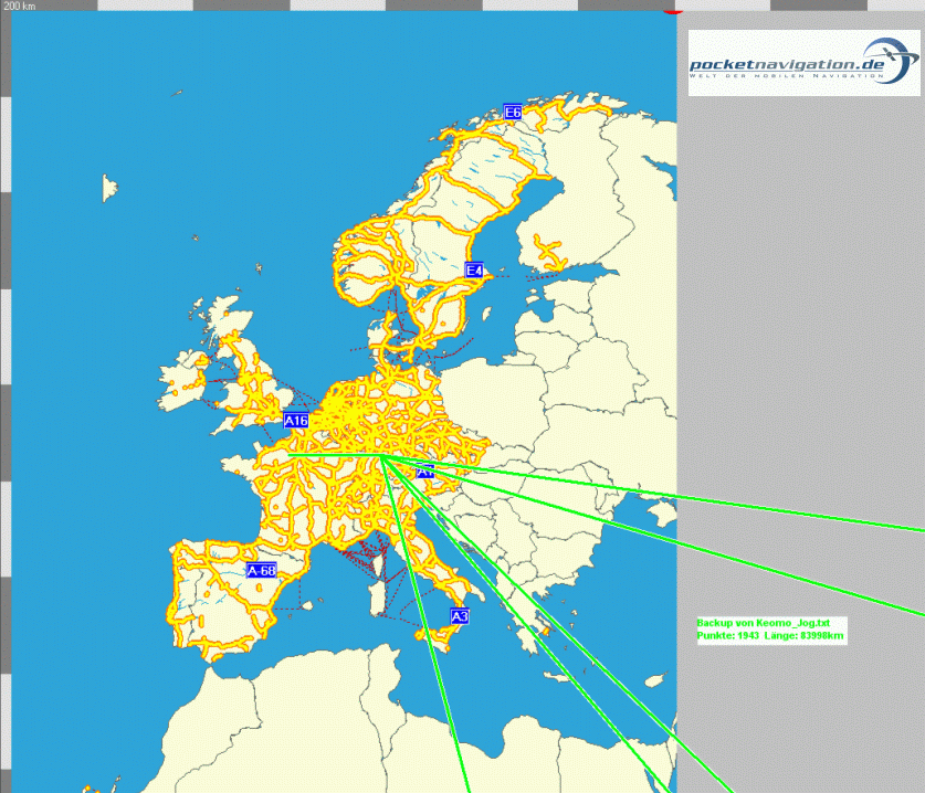 Rechts die bereits erwähnten Ausreisser nach dem Einschalten. Nach dem manuellen Entfernen von 6 Punkten – in TTQV kein Problem – wurden aus den 84.000 Kilometern einigermaßen realistische 4,5 Kilometer.
