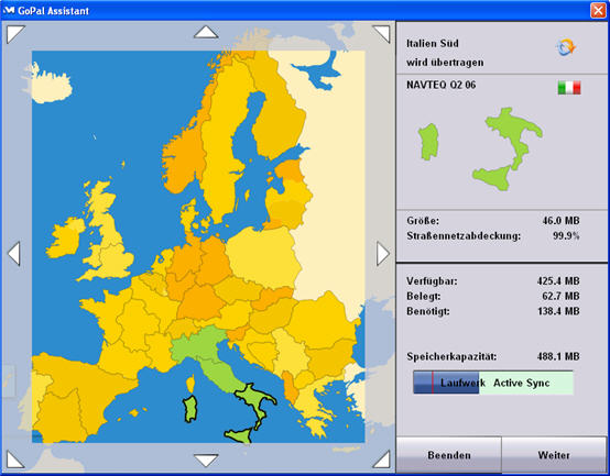 Die Bedienung des mitgelieferten GoPal Assistant ist kinderleicht. Über dieses Softwaretool auf der DVD kann das Navigationsprogramm und weitere Kartenländer über eine optionale SD-Karte nachinstalliert werden. Für eine Installation direkt im Gerät ist nur das Programm Active-Sync zu verwenden. Insgesamt stehen noch etwa 100MB Flash-Speicher zur Verfügung.