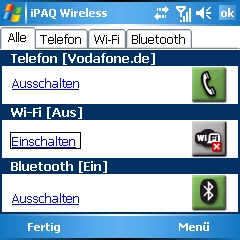 Sehr gut gefallen hat uns die vorinstallierte iPAQ Wireless Software, über die man sehr übersichtlich alle Einstellungen rund um Telefon, Wi-Fi und Bluetooth vornehmen kann. Im Heute-Screen werden dann auch platzsparend die jeweiligen Stati der Verbindungen ange- zeigt. Durch Umstellung der Systemeinstellungen auf Deutschland wechselte diese Software automatisch in unsere Landessprache.