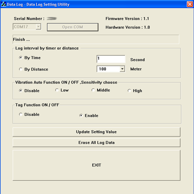 Um die Einstellungen des Loggerteils vorzunehmen, kann man den XAiOX iTrakU entweder per BT-Stick, oder mittels USB-Kabel mit dem PC verbinden. Dazu sind auf der beiliegenden CD Treiber für den Kabelbetrieb und 2 Einstell-Tools dabei. Leider liegt kein Tool für den PDA bei. Damit ist es nicht möglich die internen Loggerdaten auf einer längeren Tour auf dem PDA zu sichern