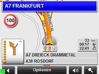 Reality View ist eine der großen Neuerungen des MobileNavigator|6.5, eine Ergänzung für die bereits länger schon vom MN6 bekannten Orientierungshilfen, Fahrspur-Assistent und reale Beschilderungsanzeige. Auch letztere zeigen in Verkehrssituationen mit mehreren Fahrbahnen rechtzeitig an, auf welcher Fahrbahn sich der Fahrer einordnen muss, um der Navigationsroute zu folgen. Diese Funktionen sind deshalb auf unübersichtlichen Kreuzungen und in Großstädten besonders hilfreich. Allerdings: Die Fahrspur-Daten sind primär bei den wirklich wichtigen und großen Kreuzungen, Bundesstrassen und Autobahnen verfügbar. Reality View ist auf Autobahnen beschränkt und ist beim 7110 und beim 5110 vorhanden. Beim 2110 kann diese Option nachgekauft werden. In der Navigation werden Richtungshinweise gemäß der realen Beschilderung eingeblendet. Die Einblendung der Ortsnamen ist in komplexen Situationen eine besonders gute Orientierung und hat sich bei den Vorgängern MobileNavigator 5 6 schon bewährt.
