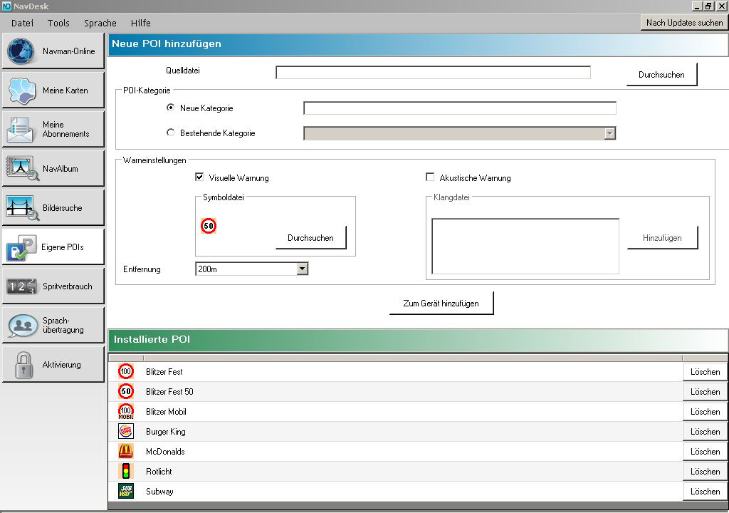 Navman hat den S90i mit einem hauseigenen Warner vor Verkehrskontrollen ausgestattet, der vor Blitzern und überwachten Ampelanlagen warnt. Allerdings hat man, möglicherweise rechtlicher Bedenken wegen, keine Möglichkeit bei Navman ein kostenpflichtiges Radar Abonnement für Deutschland zu erwerben. Dennoch, anders als mancher Mitbewerber, bietet die Smart ST Software des S90i im Zusammenspiel mit der mitgelieferten Software NavDesk2008, die einfache Möglichkeit, POIs (POINT of Interest) in die Karte einzubinden. So können auf diese Weise auch Gefahrenstellen angezeigt werden, vor denen im Falle einer Annäherung akustisch gewarnt werden kann. Die erforderlichen, aktuellen Daten (BMP, CSV) kann man bei pocketnavigation.de als POI-Dienst beziehen. Da sich diese Datenbank nicht auf Radarfallen und Rotlichtampeln beschränkt, kann man neben einer großen Anzahl freier POIs für z.B. Supermärkte, Fastfood Ketten, alternative Kraftstoffe oder Notapotheken auch kostenpflichtige Dienste wie Wetterinfos und Schnäppchenführer herunterladen. Diese große Datenbank bietet eine ideale Ergänzung zum S90I.