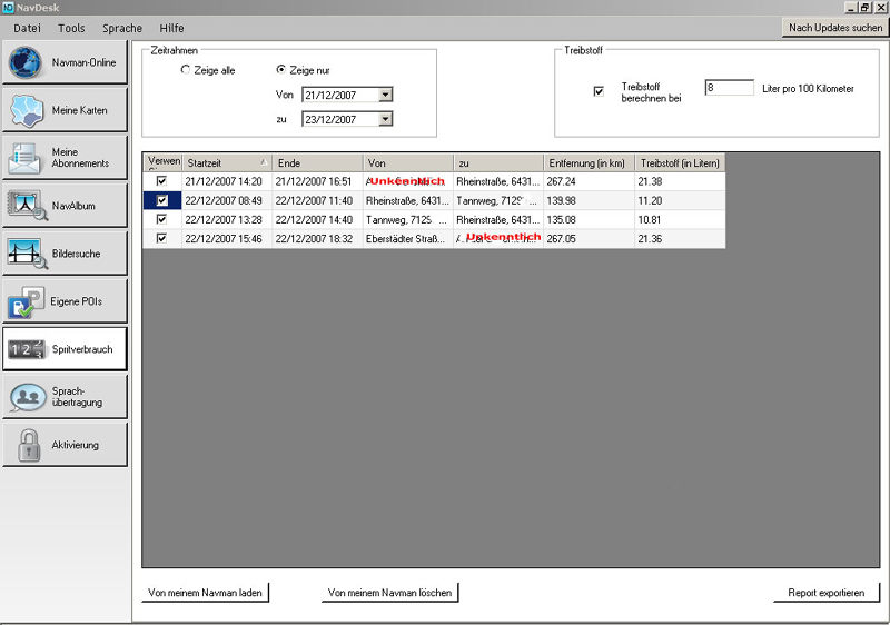Die Strecken Protokolle können komfortabel mit SmartDesk 2008 verwaltet werden, neben den Export in Excel basierte Programme wird auch der Benzinverbrauch berechnet.